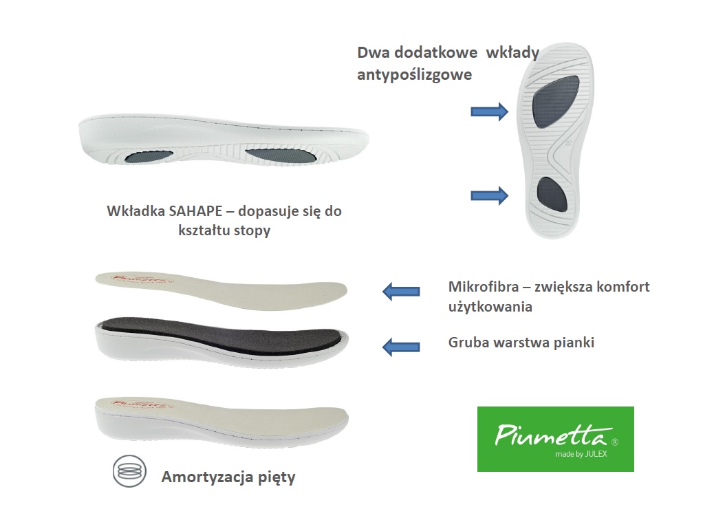 Piumetta is a collection of comfortable women footwear designated for work and everyday use. Models within this series were designed to ensure comfortable use and aesthetic values. Light, anatomically moulded soles were selected to ensure the highest level of comfort. Each model is made of best quality materials. Piumetta footwear is designated for persons exposed to overstraining their feet during a work day.